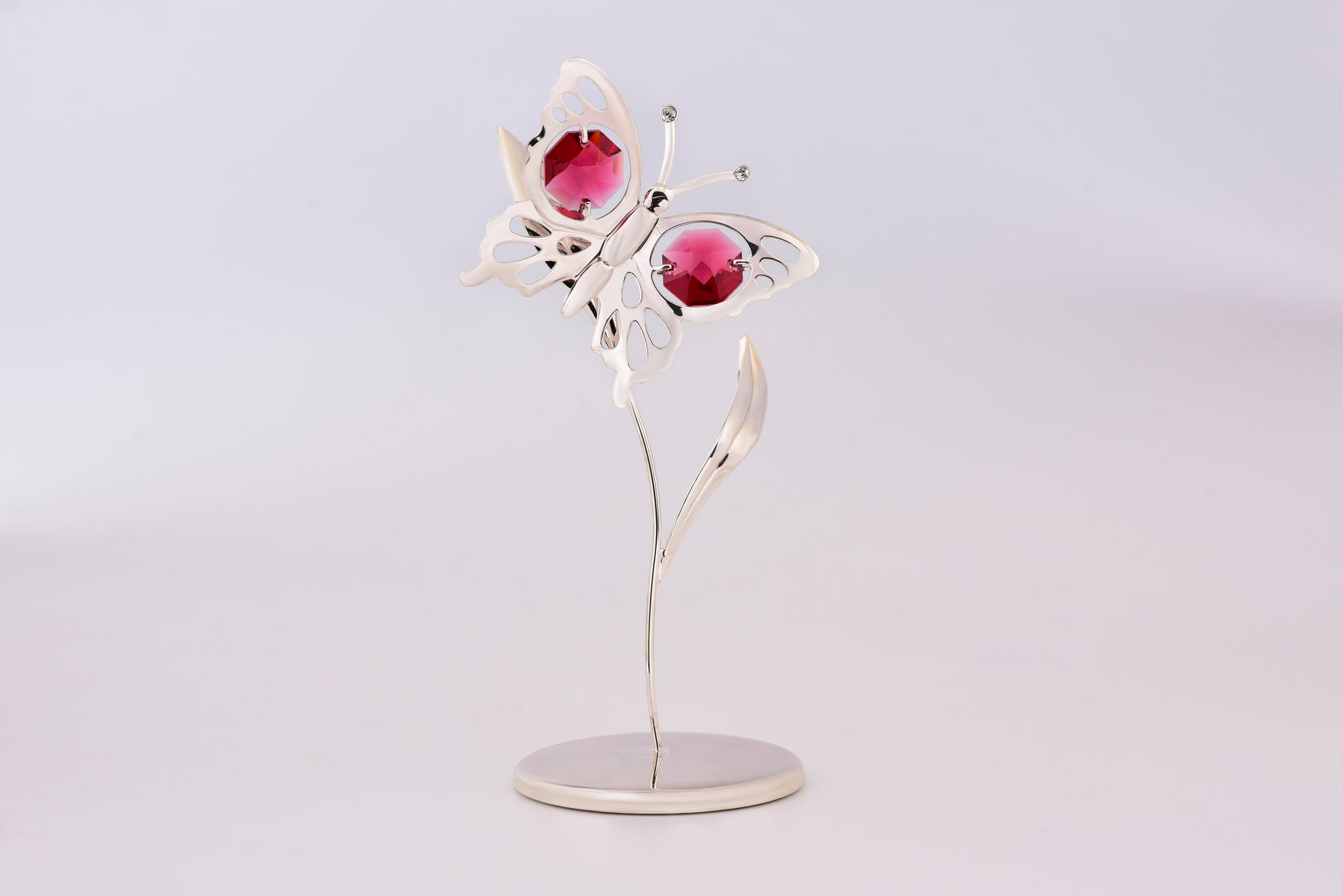 Introducing our exquisite 24-karat silver plated butterfly figurine perched gracefully on a plant stem, adorned with a shimmering leaf and exquisite Egyptian crystal. This enchanting piece captures the beauty of nature and the delicate elegance of butterflies. Display it as a symbol of transformation, grace, and the wonder of the natural world. A perfect addition to any collection or a thoughtful gift for nature enthusiasts.