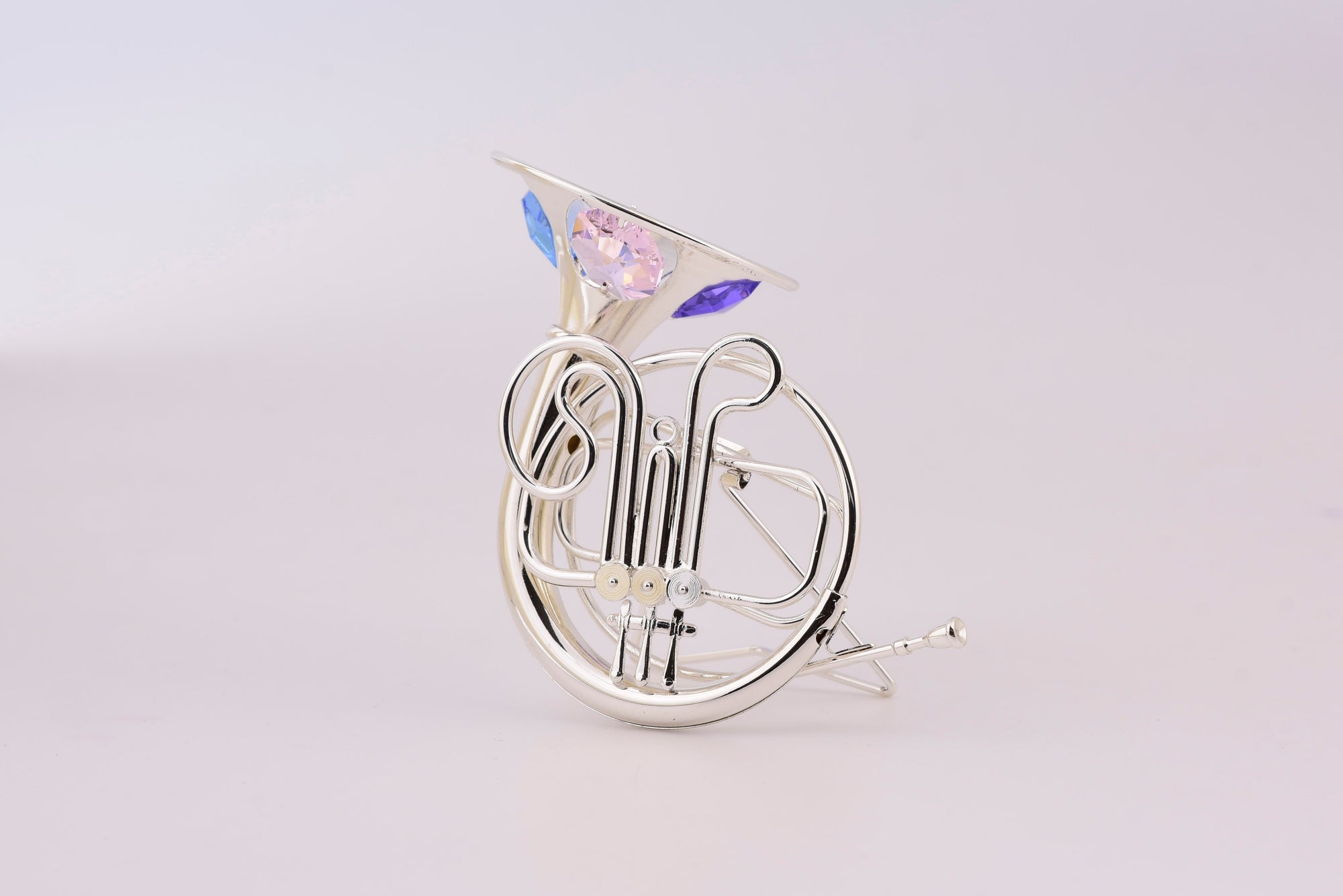 Indulge in the melodic charm of our 24K silver-plated French horn, embellished with the world's finest Egyptian crystals. This stunning piece captures the essence of musical brilliance, showcasing intricate details and impeccable craftsmanship. Display it as a symbol of your love for music and appreciation for the arts, adding an elegant touch to any space. Let the harmonious notes of this silver-plated French horn resonate with your soul and inspire your creative spirit.