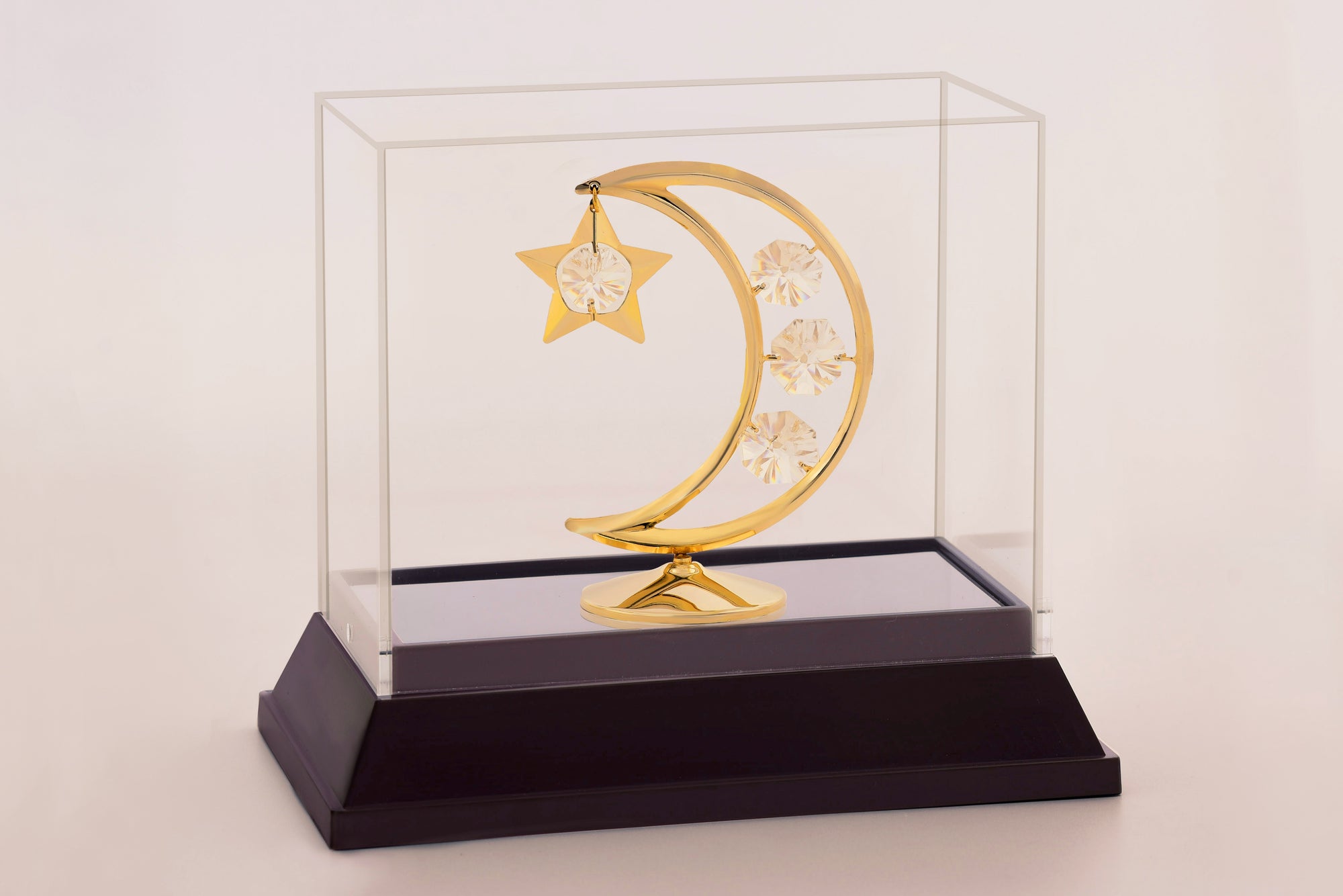 Capture celestial magic with our 24 karat gold plated Moon and Star figurine. Crafted with intricate detail, it captures the beauty and mystique of the night sky. The radiant golden hues and sparkling crystals make it a mesmerizing center piece for any space. Let this celestial duo symbolize dreams, inspiration, and the infinite possibilities that await. Whether as a thoughtful gift or a personal keepsake, it adds a touch of celestial elegance to your world.