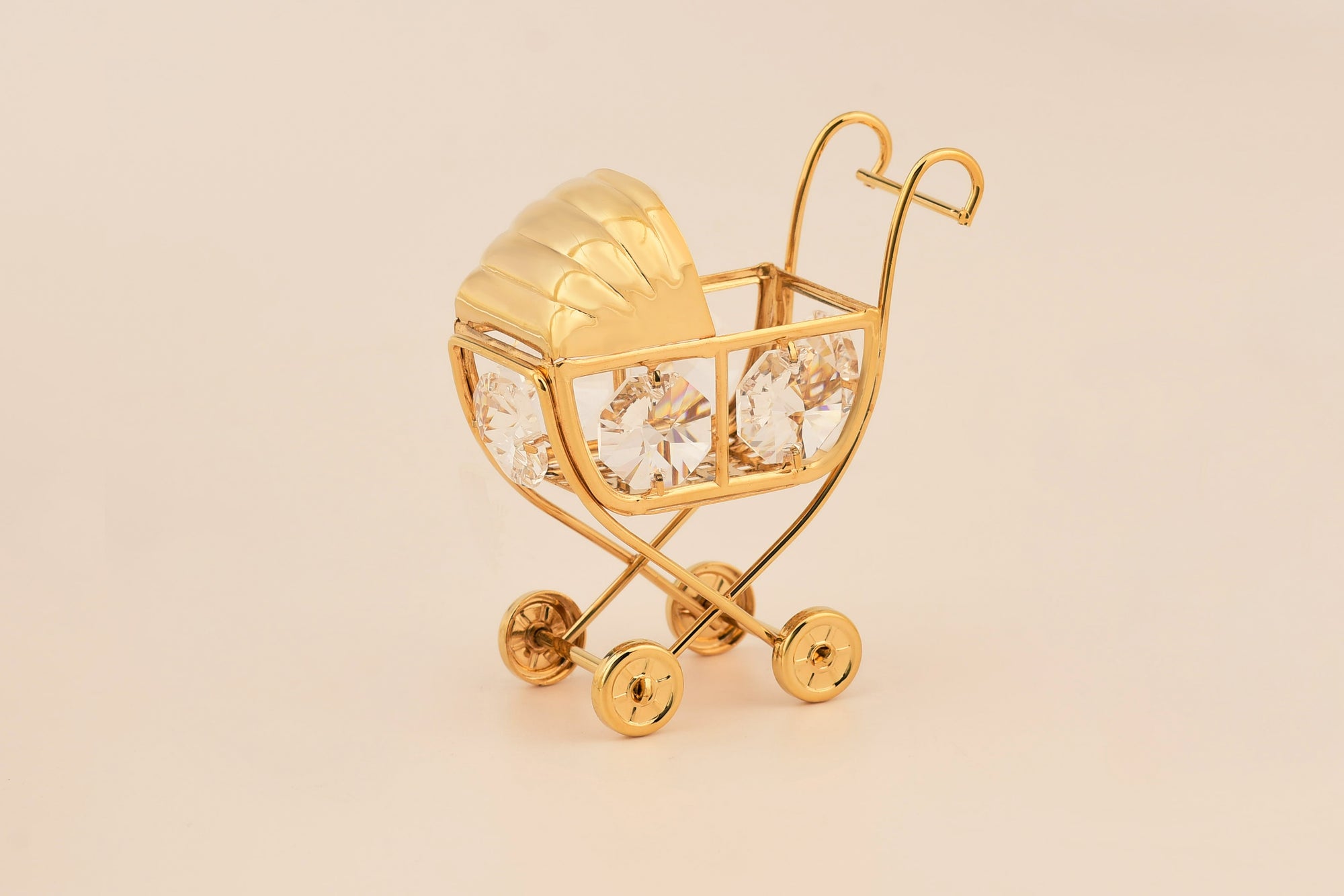 Capture the essence of timeless elegance with our 24-karat gold-plated pram figurine. Meticulously crafted and adorned with sparkling crystals, this exquisite piece celebrates the beauty of new beginnings. Display it on a shelf or mantel, and let its charm and grace be a reminder of the precious moments that shape our lives. The pram figurine is a symbol of love, hope, and the joy that comes with embracing life's precious blessings.