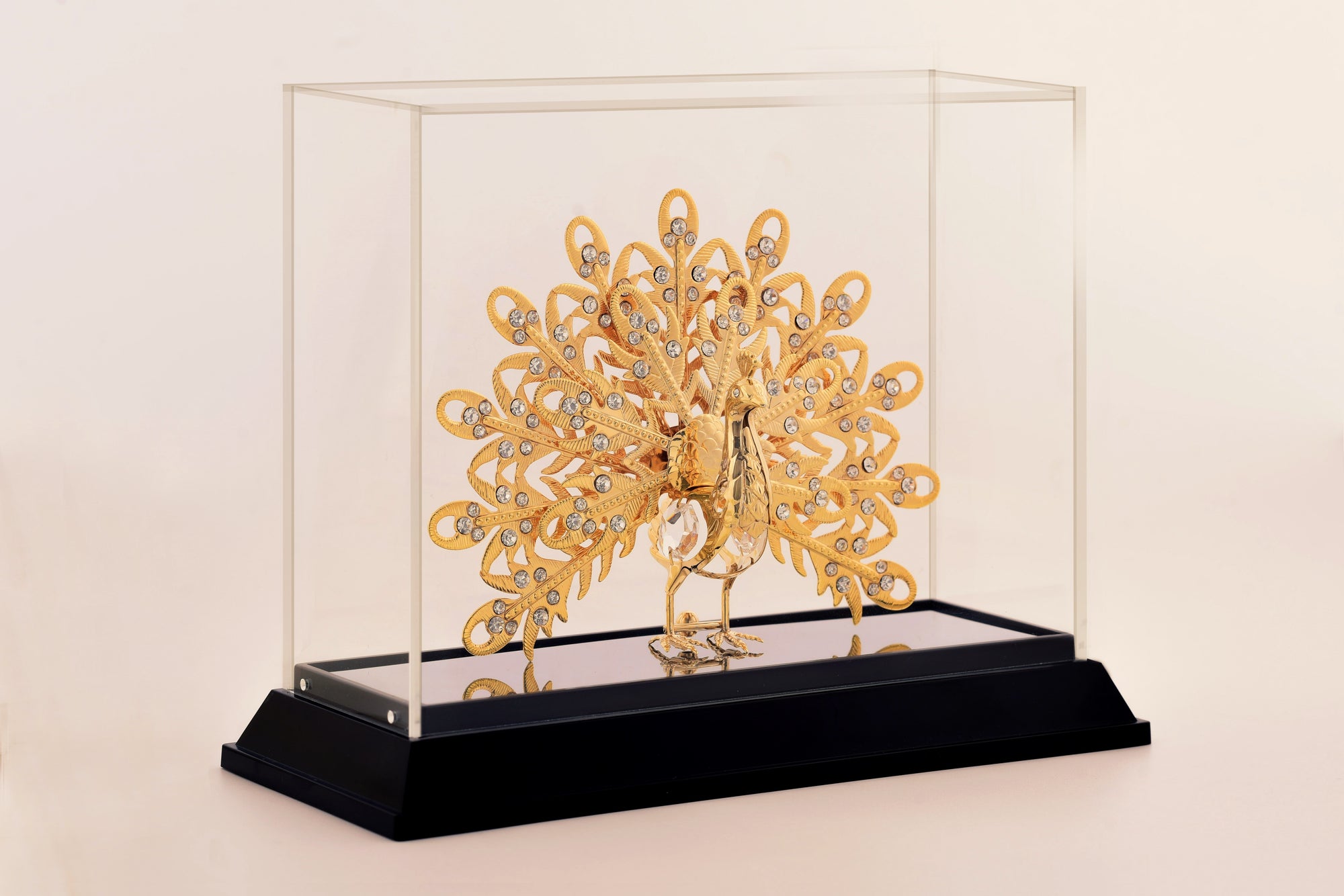 Elevate your gifting and decor with our exquisite 24K gold plated Peacock figurine adorned with finest Egyptian crystals. This majestic masterpiece symbolizes beauty, abundance, and positive energy. Its radiant colors and intricate craftsmanship make it a luxurious showpiece that captures attention. Delight your loved ones or adorn your space with this meaningful treasure, inviting prosperity and grace into your life.