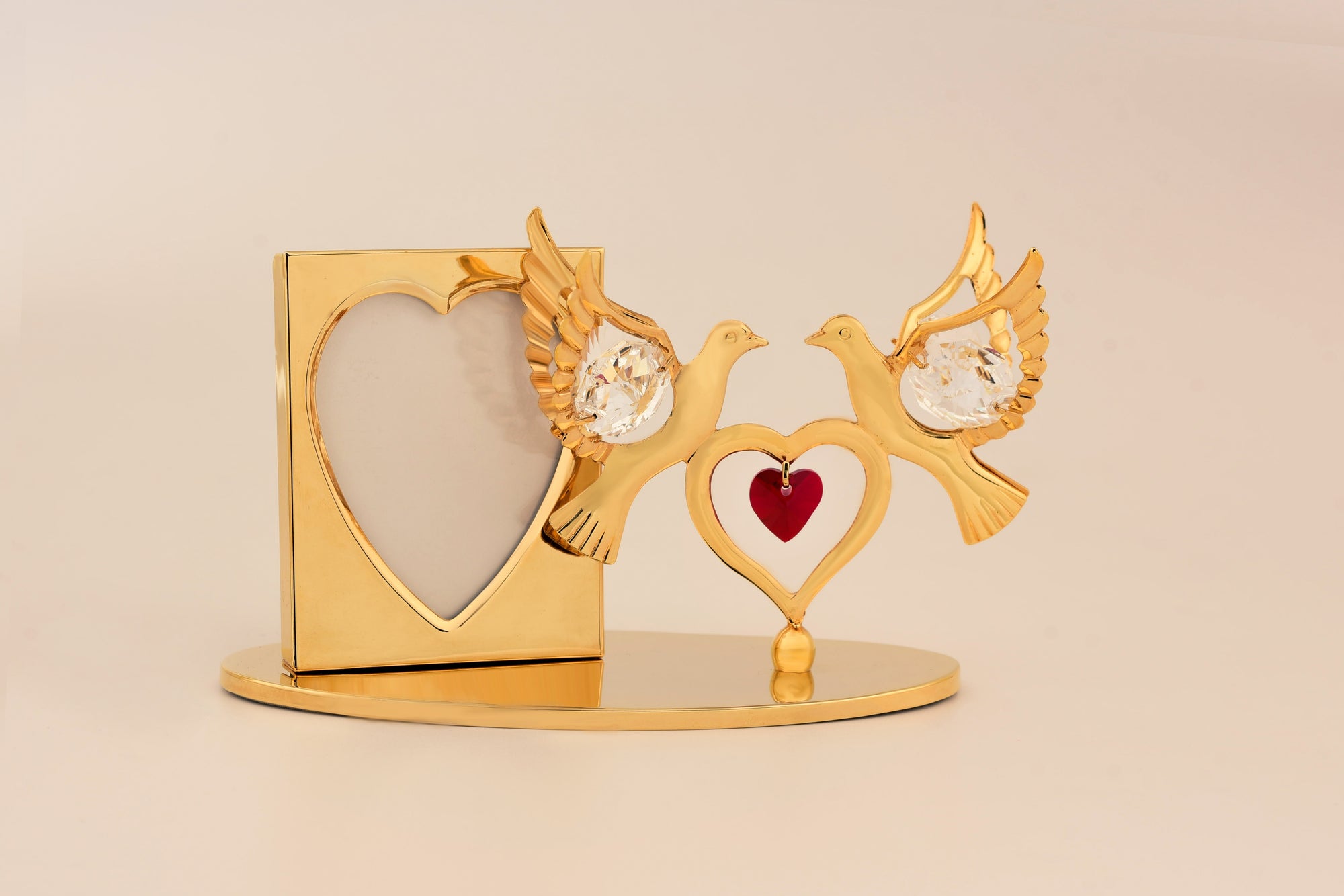Celebrate love and cherished memories with our exquisite 24-karat gold-plated Double Dove with Heart and Photo frame figurine. Two beautifully crafted doves, symbolizing love and peace, hold a heart between them, creating a heart-warming display of affection. The attached photo frame allows you to personalize this special piece with a cherished photo, preserving precious moments forever. Let this stunning figurine be a timeless reminder of love's embrace and the power of cherished memories.