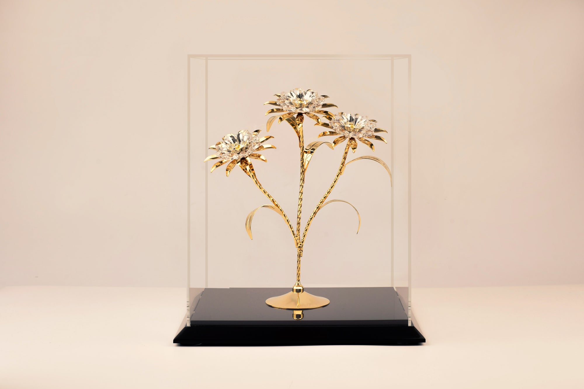 Introducing our amazing sunflower trio! These sunflowers are extra special, made with shiny gold and sparkly crystals. They bring a touch of luxury and elegance to any space. With their bright and cheerful petals, they'll make you smile every day. Let these beautiful sunflowers brighten up your room and fill it with happiness. It's like having a piece of sunshine right at home.