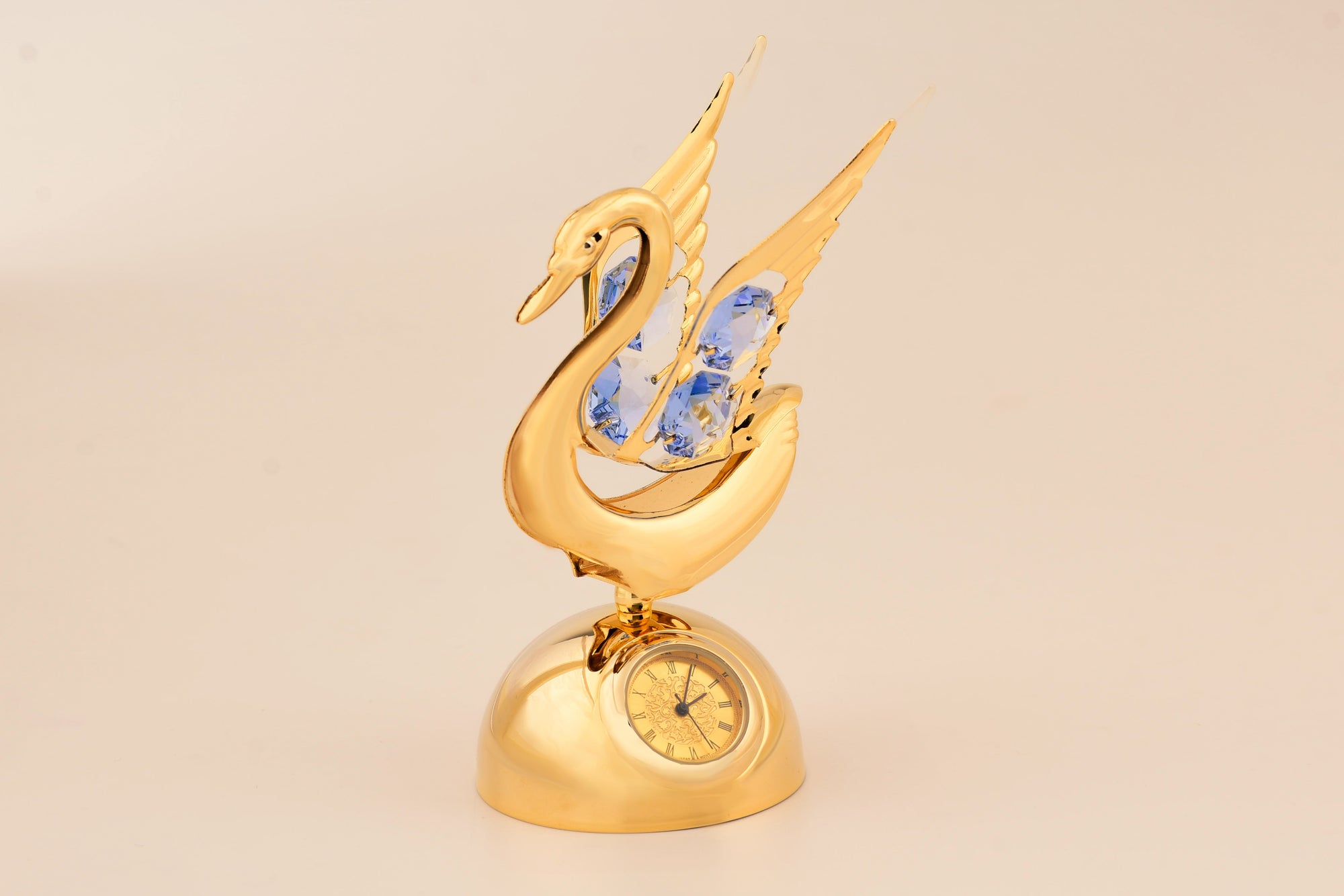 Introducing our magical 24K gold-plated swan with clock figurine! This enchanting piece is like having a special swan friend who can also tell the time. It sparkles with beautiful crystals and adds a touch of elegance to any room. It's the perfect gift for anyone who loves swans and wants a little sparkle in their life. Let the enchanting presence of this swan captivate you and elevate your surroundings with its exquisite craftsmanship and timeless allure.